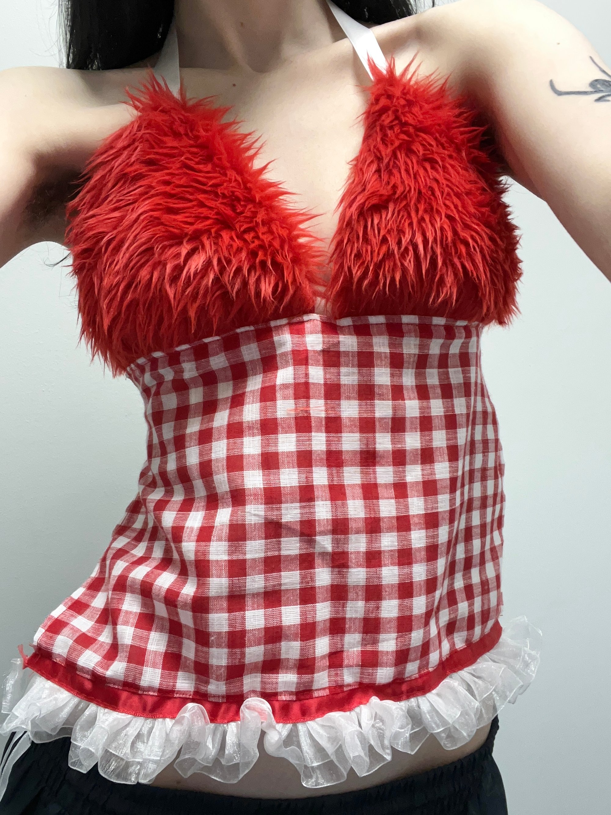 FULLY LINED RED FUR CUPS GINGHAM BODY IVORY NECK & BACK RIBBON TIES RED & WHITE FRILL TRIM HANDMADE SIZE SMALL/EXTRA SMALL